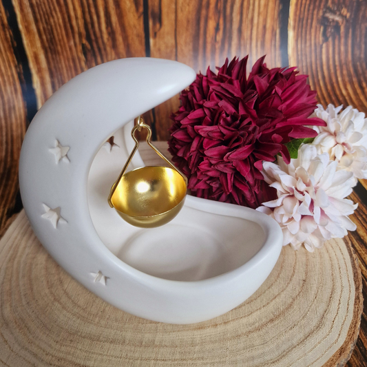White Crescent Moon Wax/Oil Burner with Gold Hanging Dish