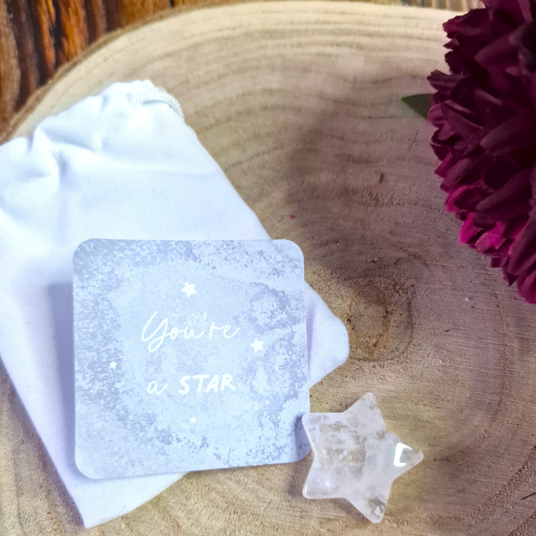 Each start comes in it's own white velvet drawstring bag and includes a "You're a star" sentiment card.